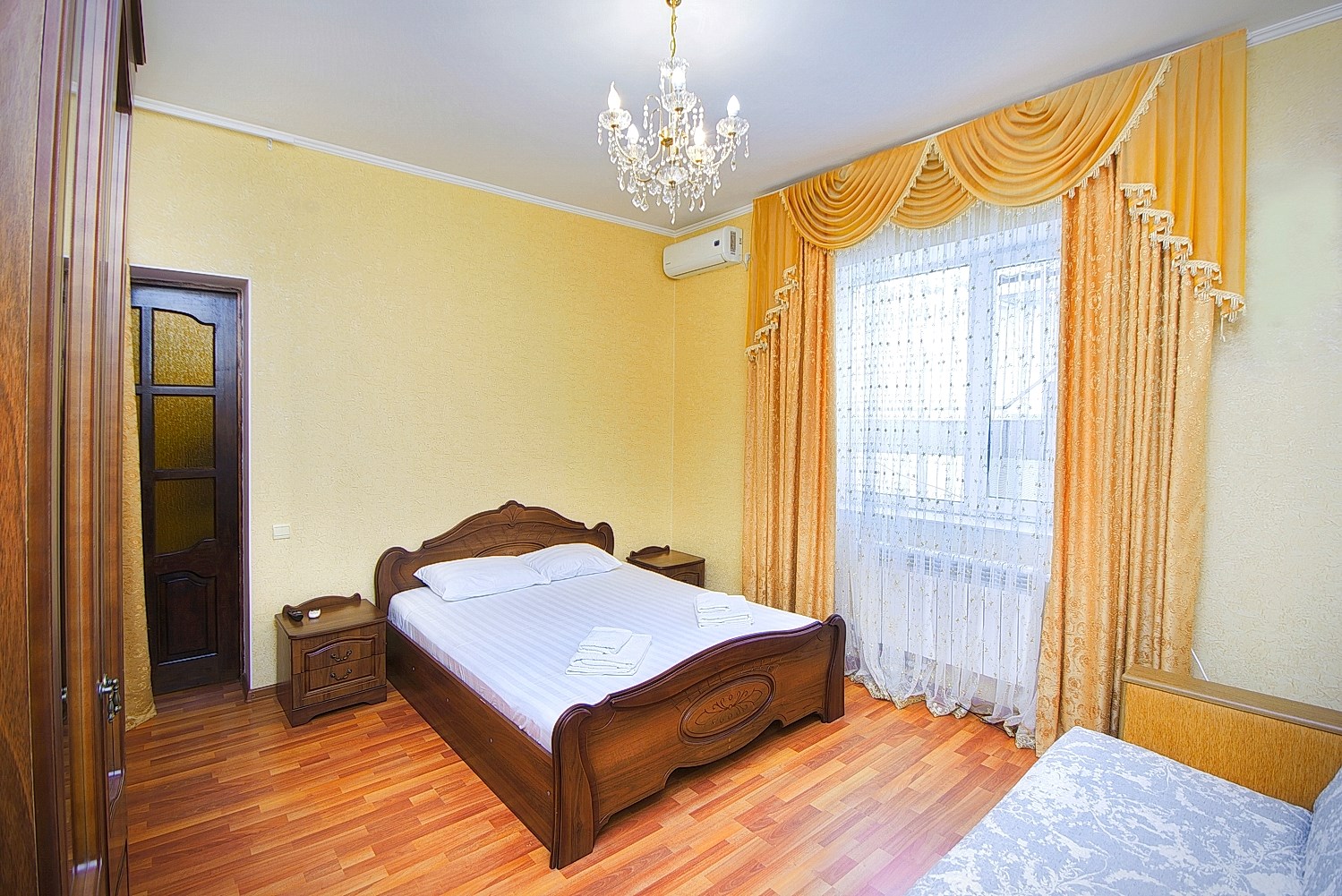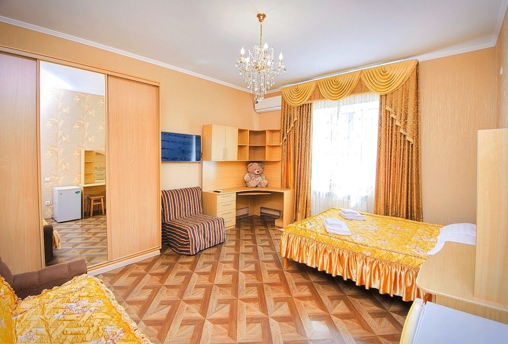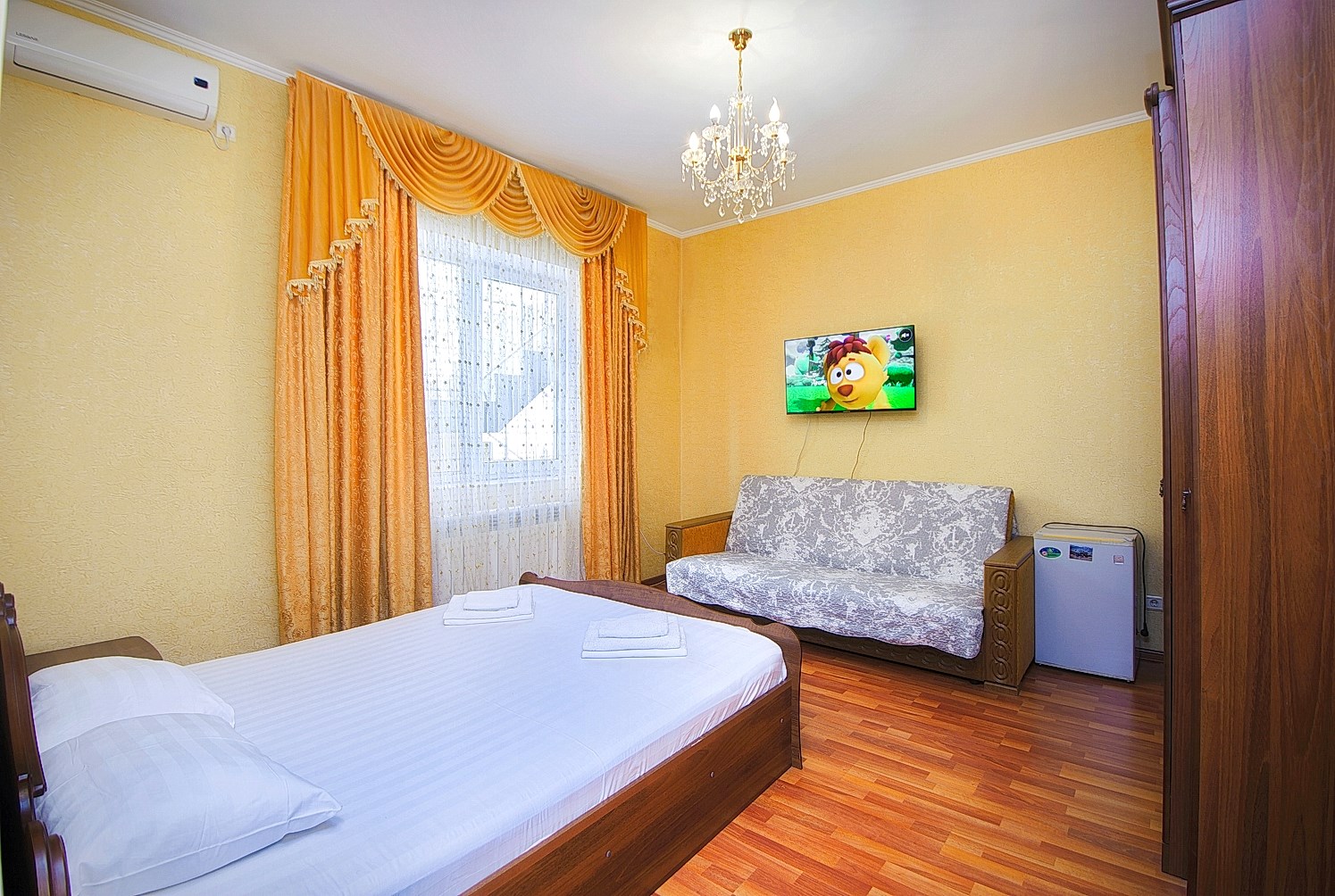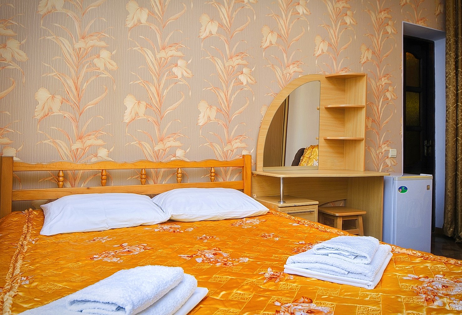 Номер представлен двуспальной кроватью, раскладным диваном (4-и основных места). В номере телевизор, кондиционер, мини-холодильник, шкаф, прикроватные тумбы, WI-FI. Душевая кабина и сан. узел на этаже (на 2 номера).