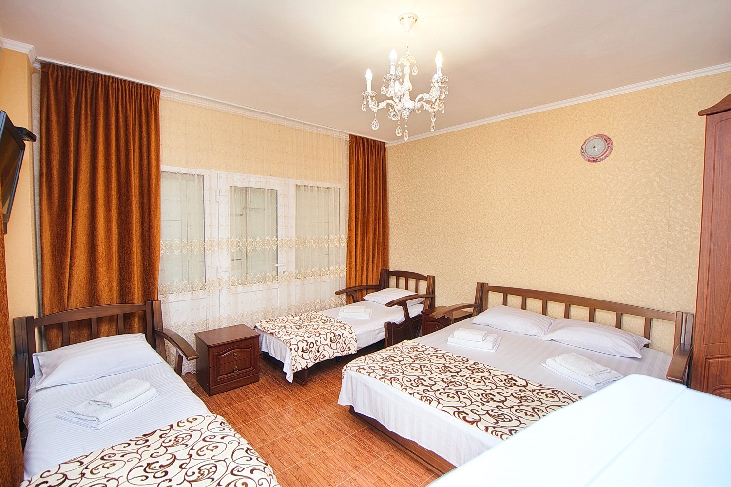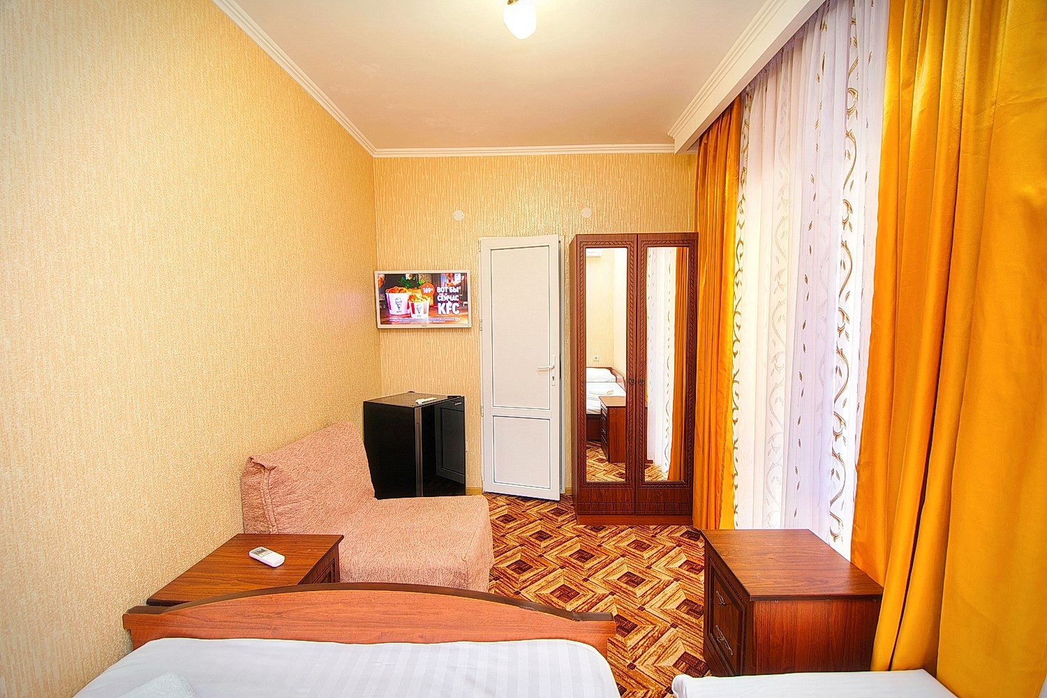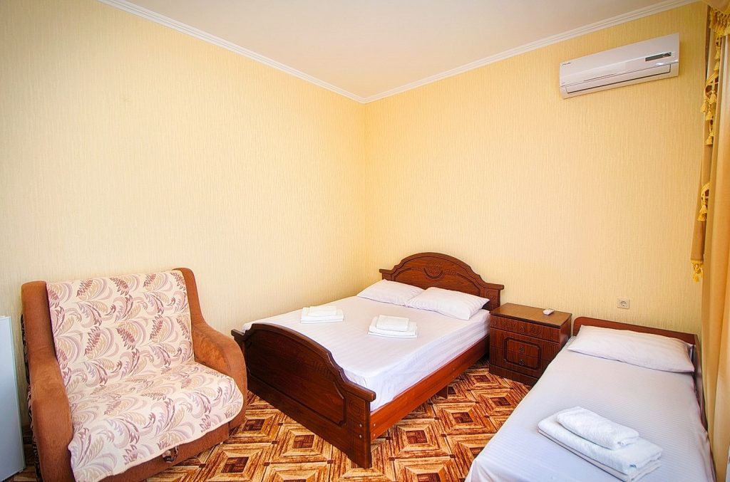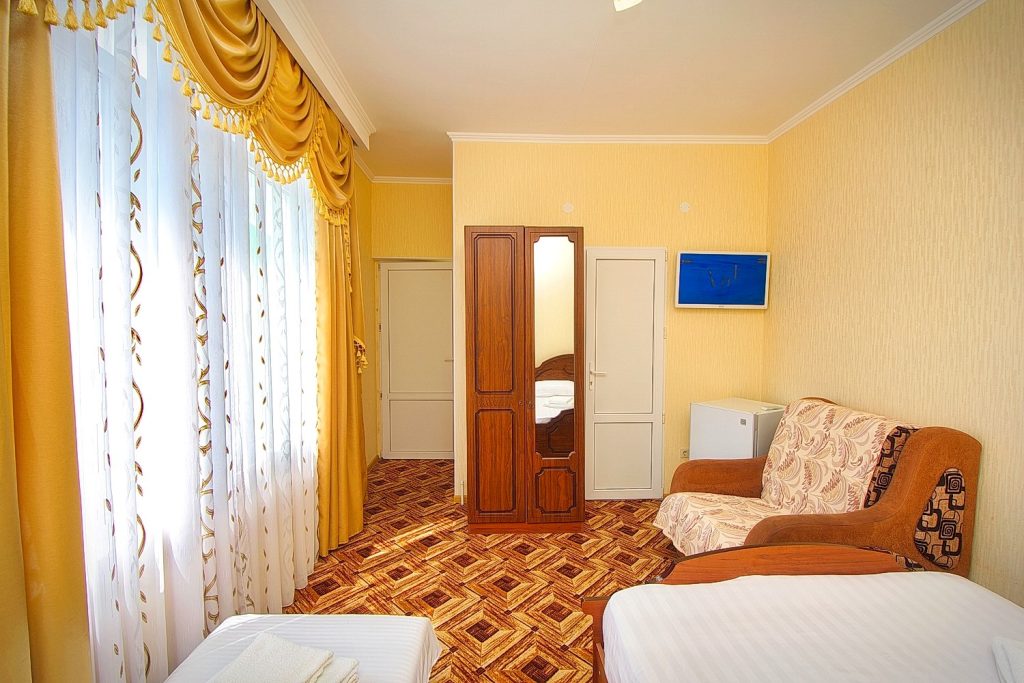 Номер представлен двуспальной кроватью и 2-мя раздвижными креслами. В номере телевизор, кондиционер, мини-холодильник, шкаф, прикроватные тумбы, WI-FI. Душ и сан. узел в номере.